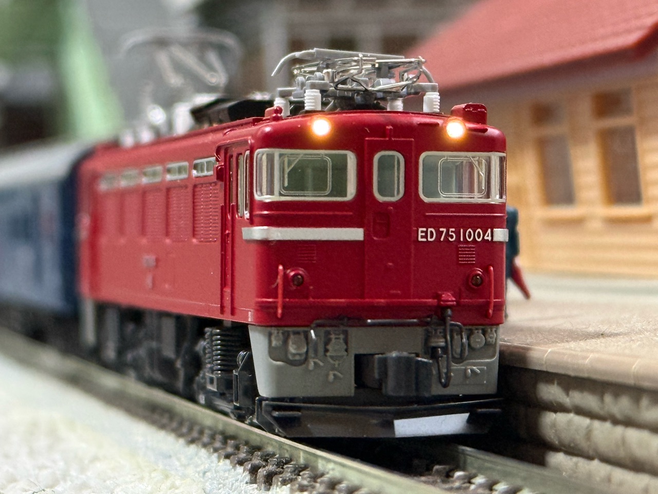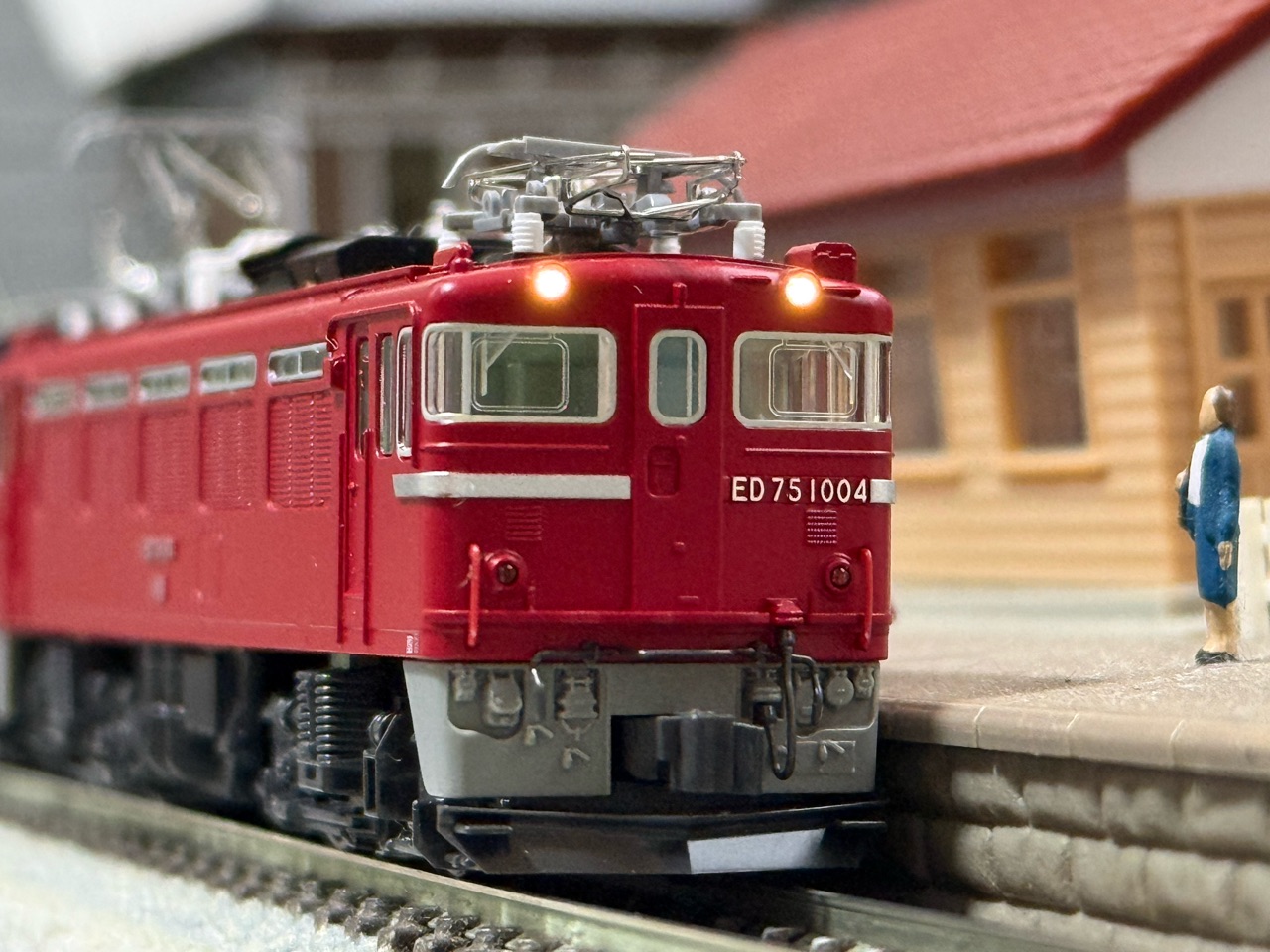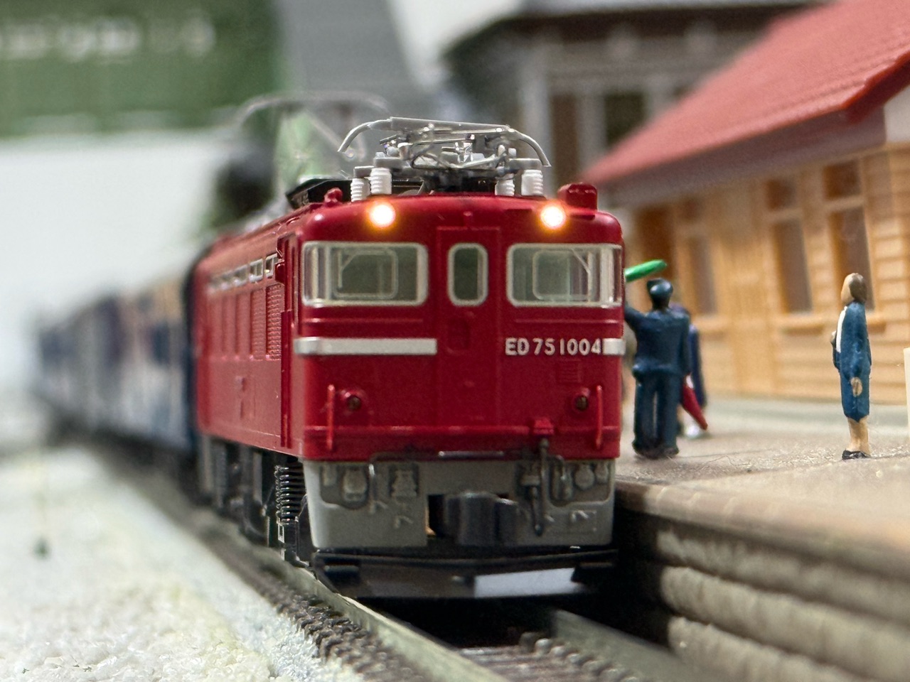 2026年02月08日 KATO ED75 1000 前期形 夜行急行「八甲田」 こんにちは。なみとの風です。 今日は雪になるかな…☃️❄️ ということで、前回はEF57でしたが、お次はED75 1000番台で引き続き夜行急行「八甲田」のお楽しみです 💫 おー美しい… ✨ KATO 3075-1 ED75 1000番台 前期形 折角カッコいい電気機関車なんですが、我が家ではなかなか登板機会がまわってこないんですよね😆 久しぶりの登板なので、今日はここぞとばかり頑張ってもらいましょう 🛤️🚦 交流機が牽く旧型客車も色のアクセントがあって美しいですよね ✨ 本日も癒されました… ☕️ ご覧いただきありがとうございました。 それでは、また 🔽 鉄道コム tetsudo.com 「機関車」カテゴリの最新記事 タグ :#KATO#ED75#夜行急行「八甲田」#スハ43系 < 前の記事次の記事 > コメント コメント一覧 (2) 1. 波浪規定の部屋 2026年02月08日 08:49 こんにちは。 連日の<八甲田>、大変いいものを見せて頂きました。 今朝は当方の住まいでは珍しい一面の雪景色、 赤い電機が雪だるまになって青森を目指す姿が、 フラッシュバックいたしました^^ 0 namitono_kaze がしました 2. なみとの風 2026年02月08日 09:28 >>1 おはようございます☀ そうですよね。雪を巻き上げて走る姿カッコいいですよね✨残念ながら我が家のレイアウトに雪景色はないですが、某付録の背景写真でも置いてみましょうかね…😆 0 namitono_kaze がしました コメントフォーム 名前 コメント 記事の評価 リセット リセット 顔 星 情報を記憶 コメントを投稿する