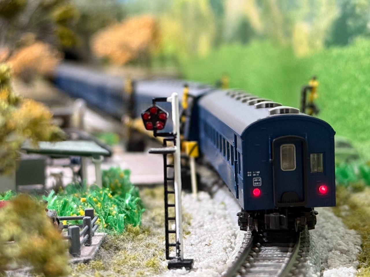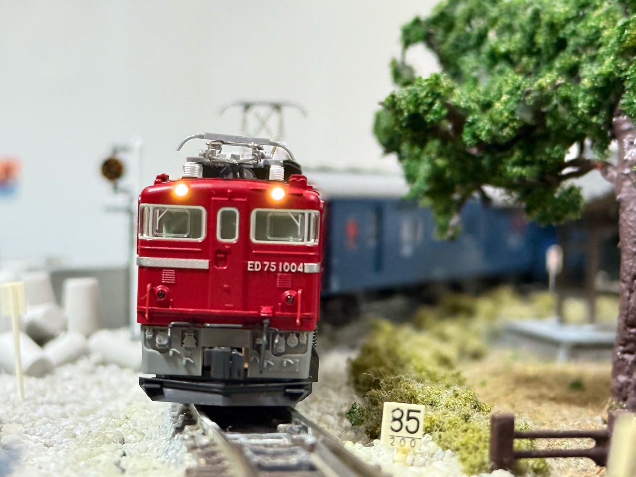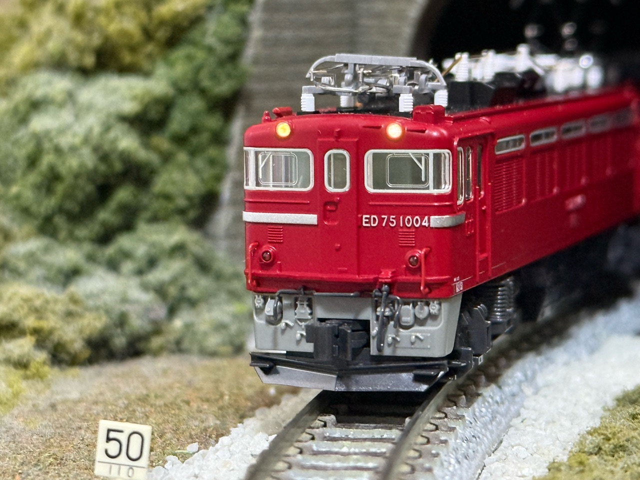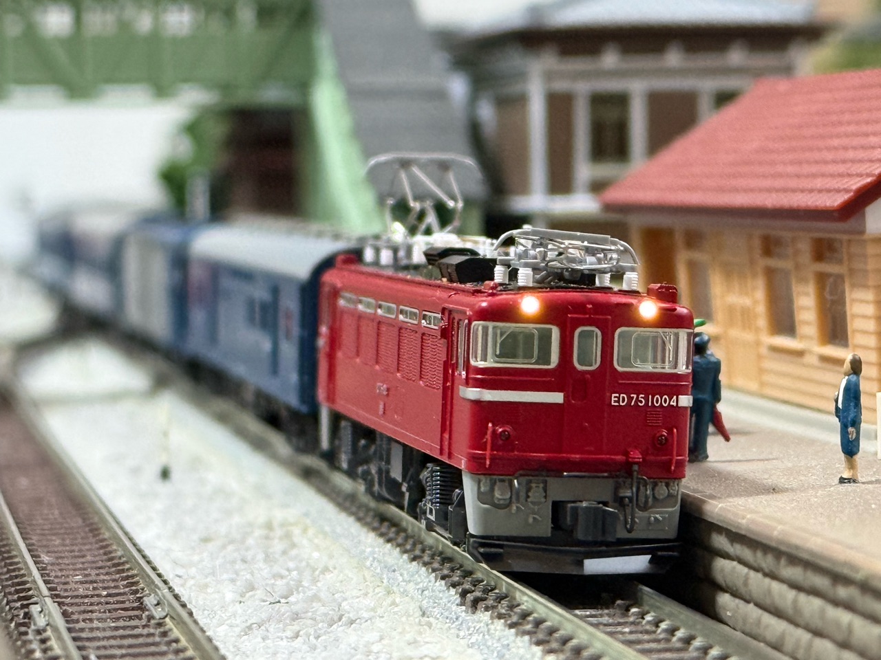 2026年02月08日 KATO ED75 1000 前期形 夜行急行「八甲田」 こんにちは。なみとの風です。 今日は雪になるかな…☃️❄️ ということで、前回はEF57でしたが、お次はED75 1000番台で引き続き夜行急行「八甲田」のお楽しみです 💫 おー美しい… ✨ KATO 3075-1 ED75 1000番台 前期形 折角カッコいい電気機関車なんですが、我が家ではなかなか登板機会がまわってこないんですよね😆 久しぶりの登板なので、今日はここぞとばかり頑張ってもらいましょう 🛤️🚦 交流機が牽く旧型客車も色のアクセントがあって美しいですよね ✨ 本日も癒されました… ☕️ ご覧いただきありがとうございました。 それでは、また 🔽 鉄道コム tetsudo.com 「機関車」カテゴリの最新記事 タグ :#KATO#ED75#夜行急行「八甲田」#スハ43系 < 前の記事次の記事 > コメント コメント一覧 (2) 1. 波浪規定の部屋 2026年02月08日 08:49 こんにちは。 連日の<八甲田>、大変いいものを見せて頂きました。 今朝は当方の住まいでは珍しい一面の雪景色、 赤い電機が雪だるまになって青森を目指す姿が、 フラッシュバックいたしました^^ 0 namitono_kaze がしました 2. なみとの風 2026年02月08日 09:28 >>1 おはようございます☀ そうですよね。雪を巻き上げて走る姿カッコいいですよね✨残念ながら我が家のレイアウトに雪景色はないですが、某付録の背景写真でも置いてみましょうかね…😆 0 namitono_kaze がしました コメントフォーム 名前 コメント 記事の評価 リセット リセット 顔 星 情報を記憶 コメントを投稿する