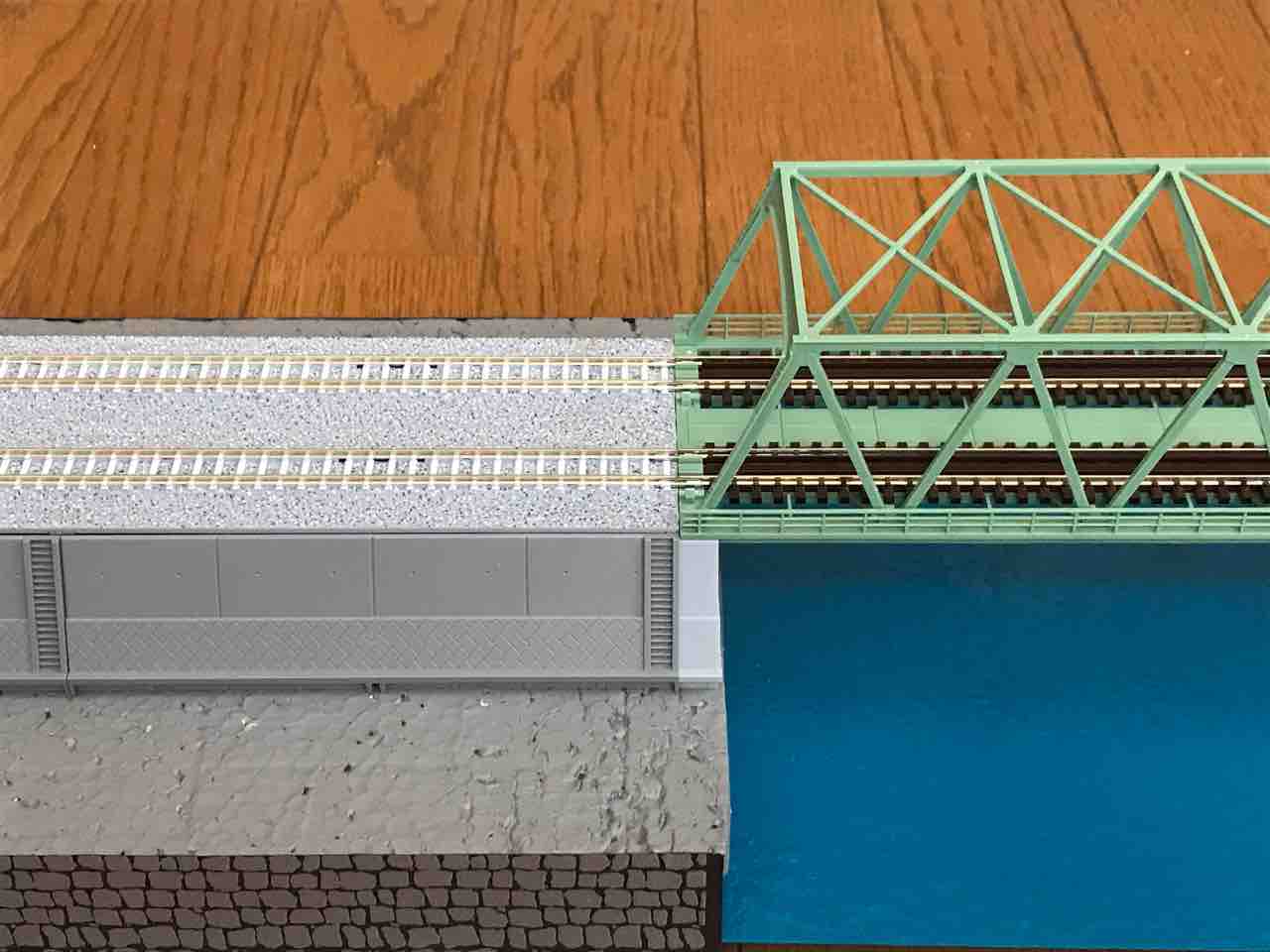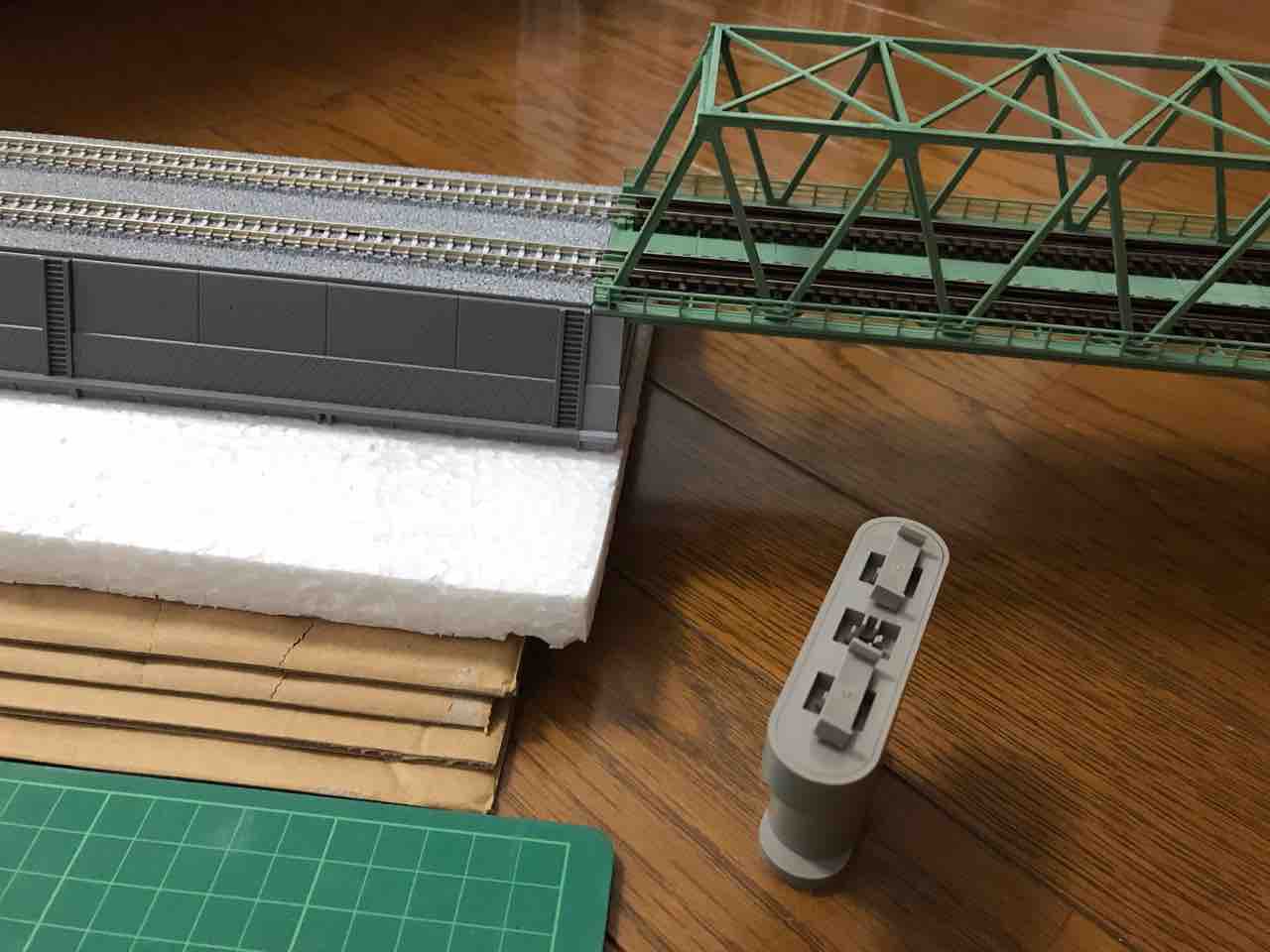 TOMIX製の高架、鉄橋などの標準的な高さは橋脚P10(高さ約65mm)が基本となっており、これに合わせるため、説明書どおりに築堤を二段重ねにすると…